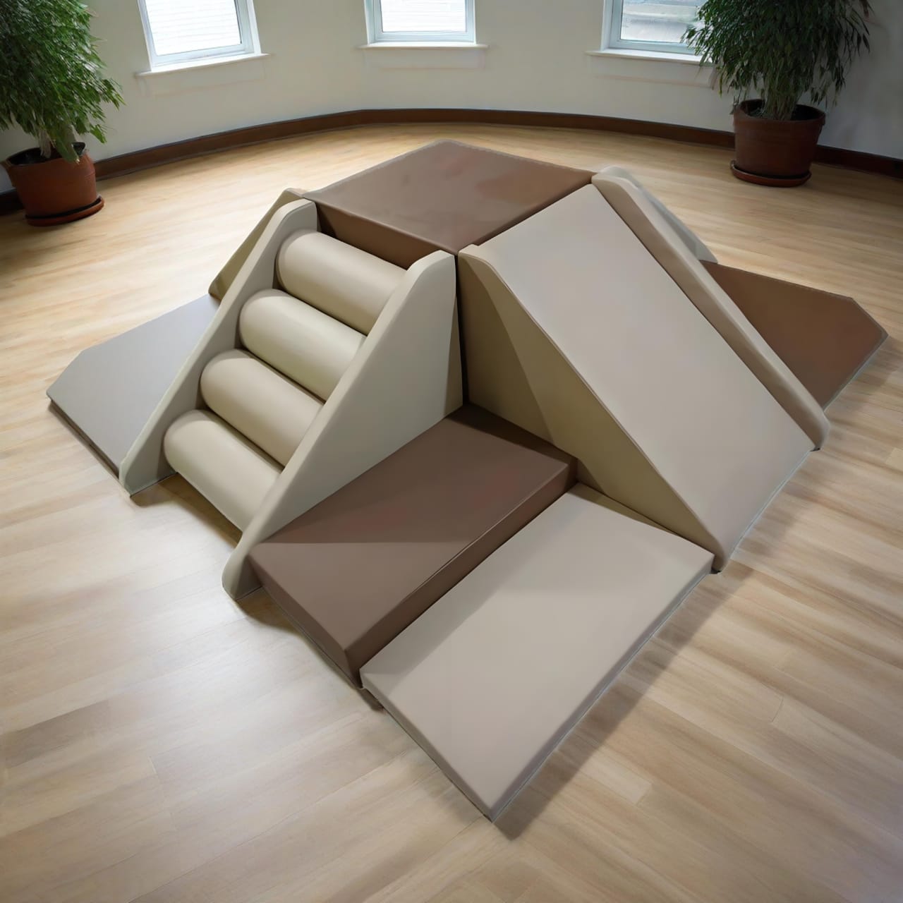 ​Multi-Activity Climbers: Features a comprehensive indoor gym with a foam slide, curved corner steps, and a central platform to encourage crawling and climbing.